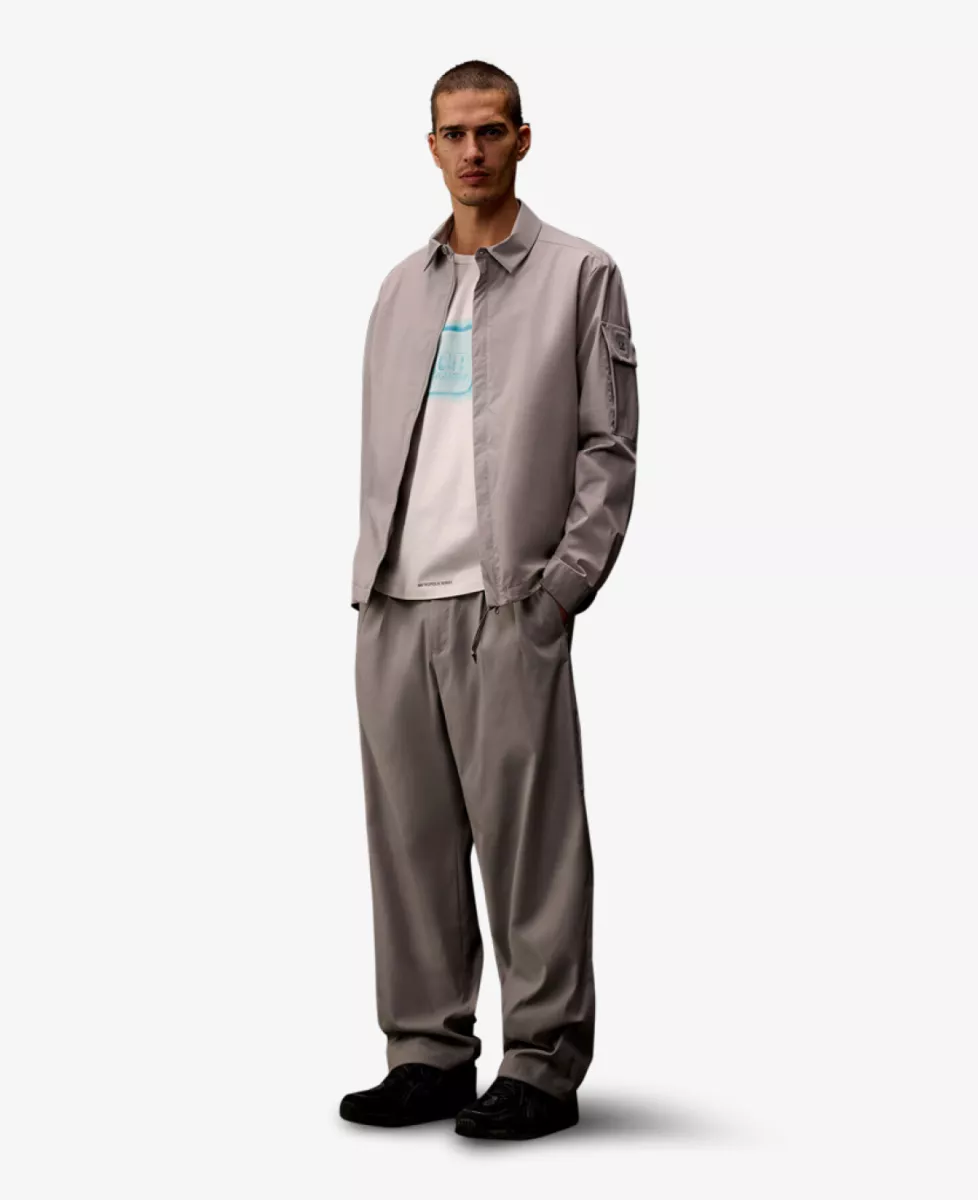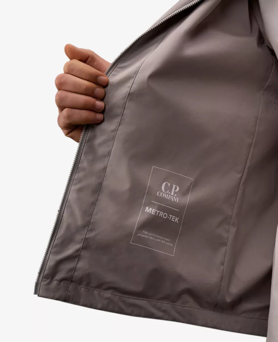 Jack van C.P. Company in lichtgrijs, met ritssluiting, klassieke kraag en logo op de mouw.