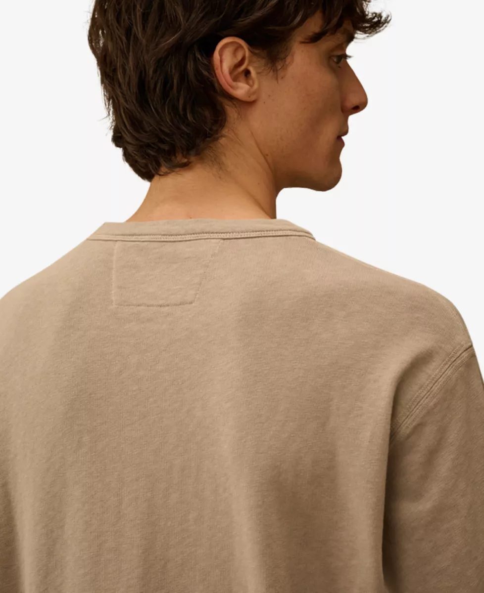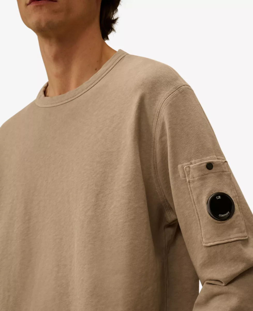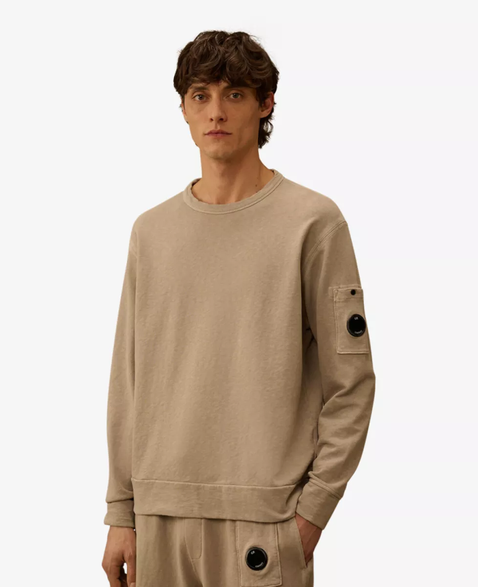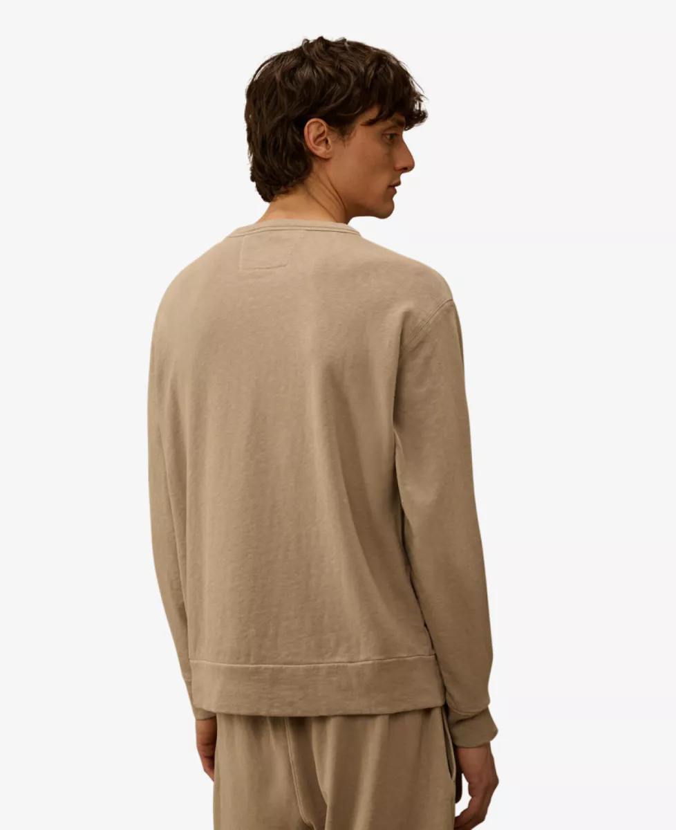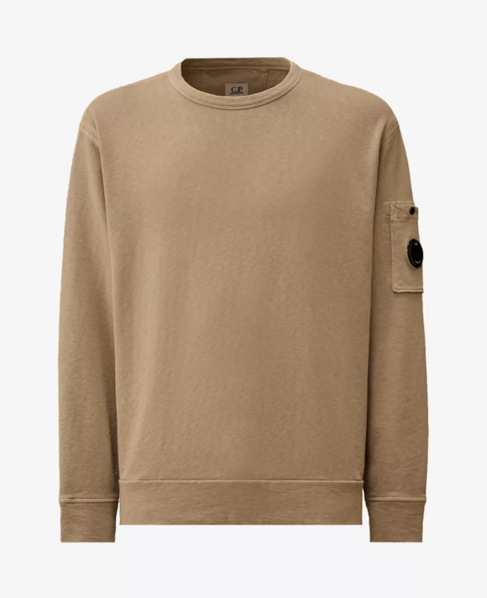 Crew neck sweater van C.P. Company in zandkleur, gemaakt van 100% katoen. Deze sweater heeft een losvallende pasvorm, ronde hals en het iconische label op de mouw.