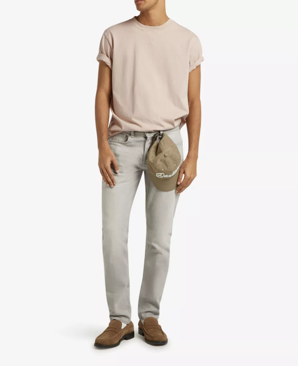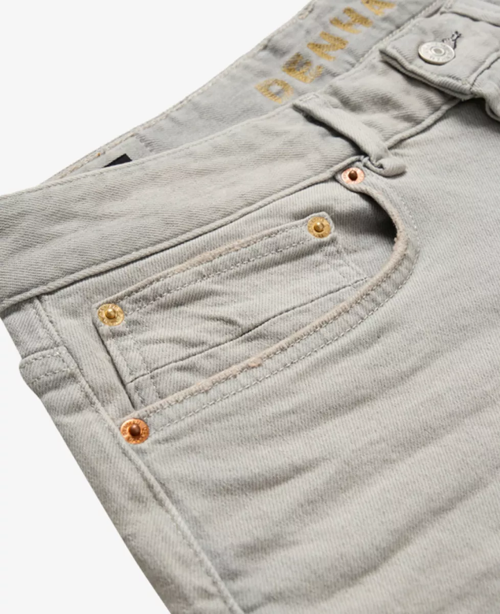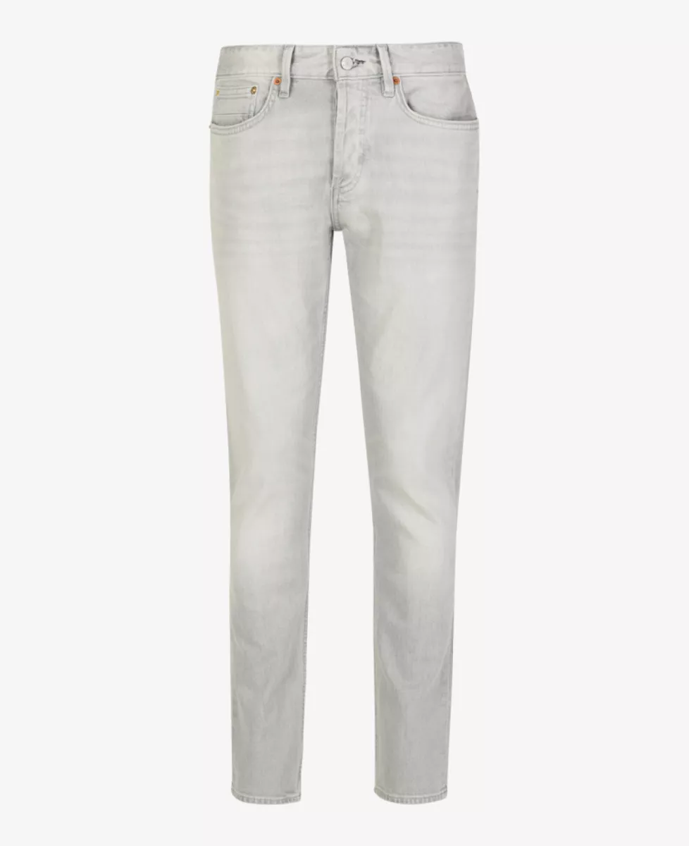Deze klassieke five-pocket slim fit jeans heeft een slanke pasvorm van mid-rise taille tot enkel. De grijze kleur met subtiele wassing en tonale stiksels, gecombineerd met zwarte knopen en rivets, geeft de jeans een stoere en eigentijdse uitstraling.