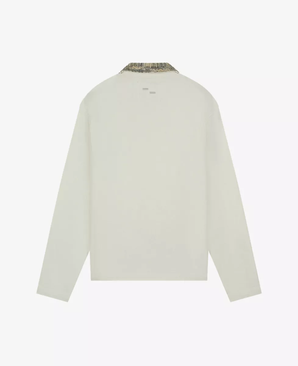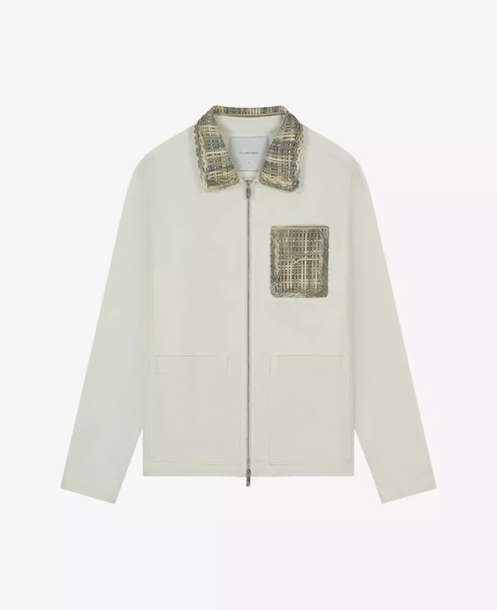 Worker Jacket ‘Panier’ van Filling Pieces in ecru. De kraag en borstzak zijn vervaardigd met een custom ‘Gowtu Raffia’-weefsel.