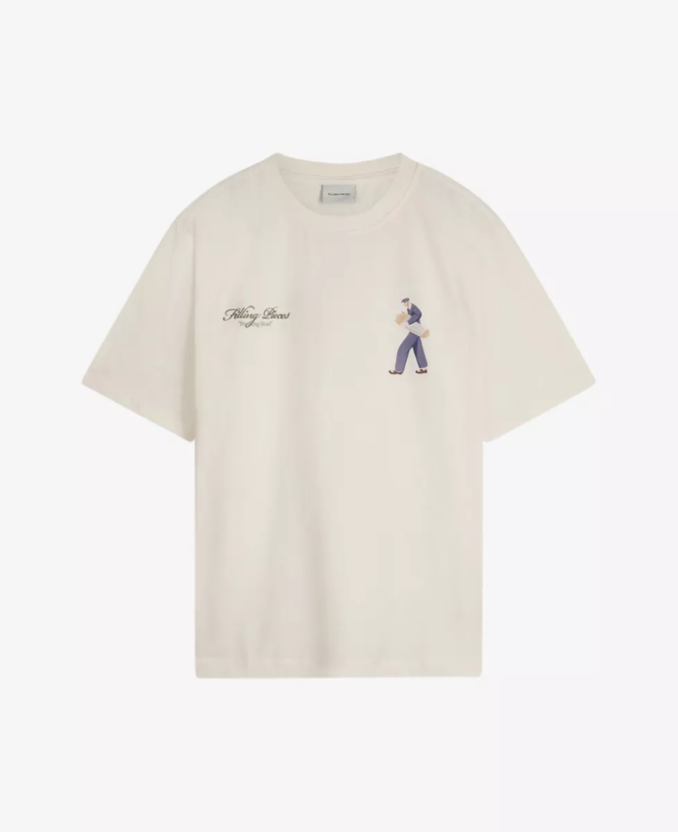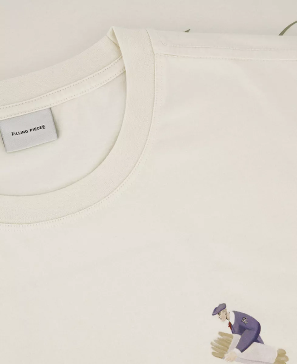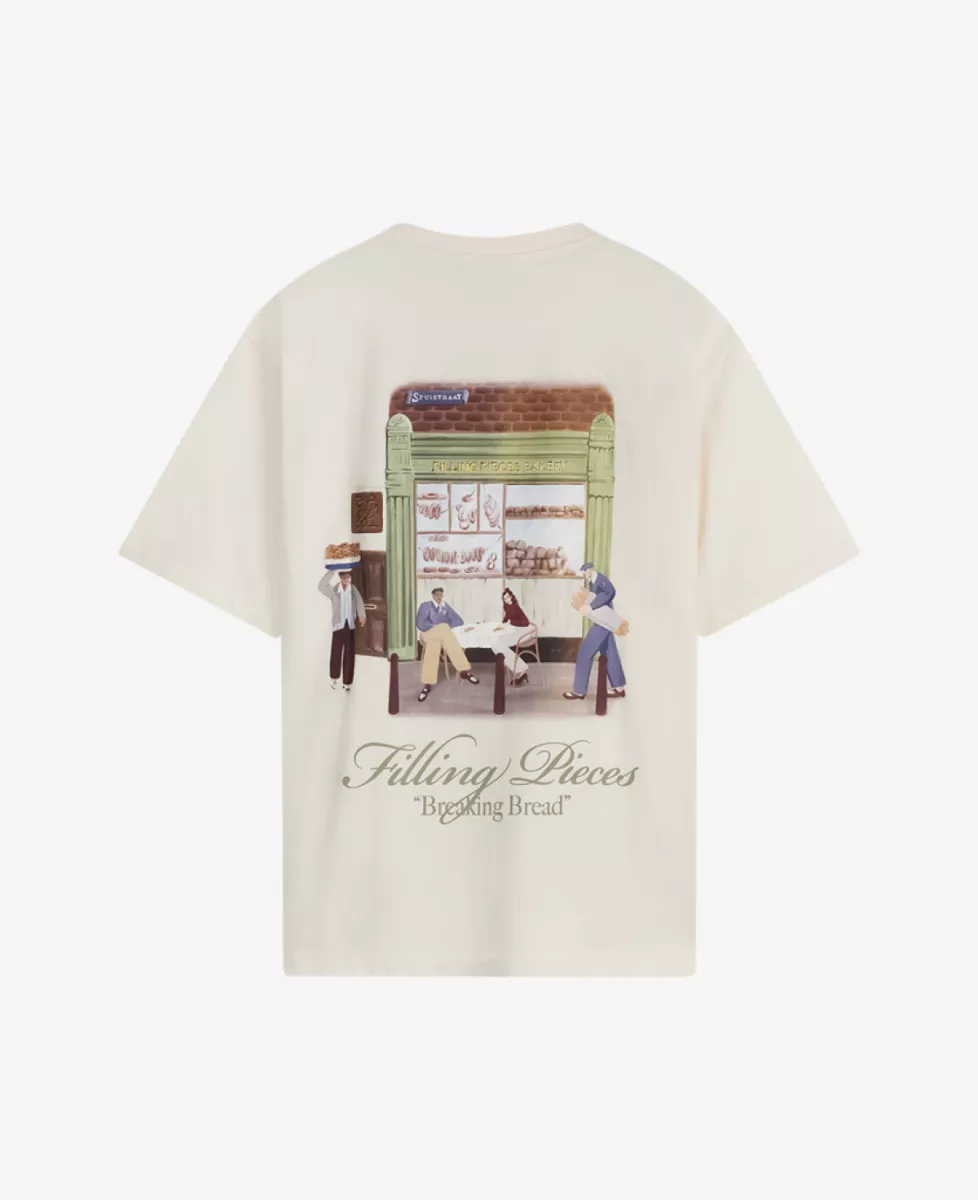 ‘Bakery’ T-shirt van Filling Pieces in beige. Dit originele shirt is gemaakt van biologisch katoen en heeft een grafische print op het voor- en achterpand.