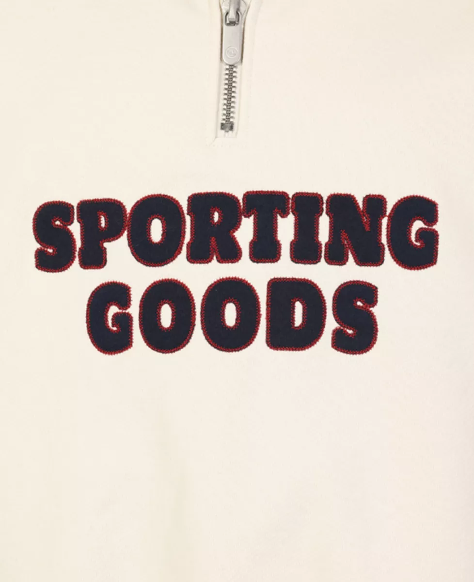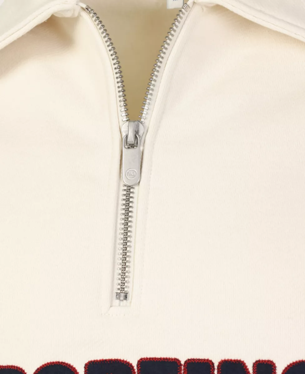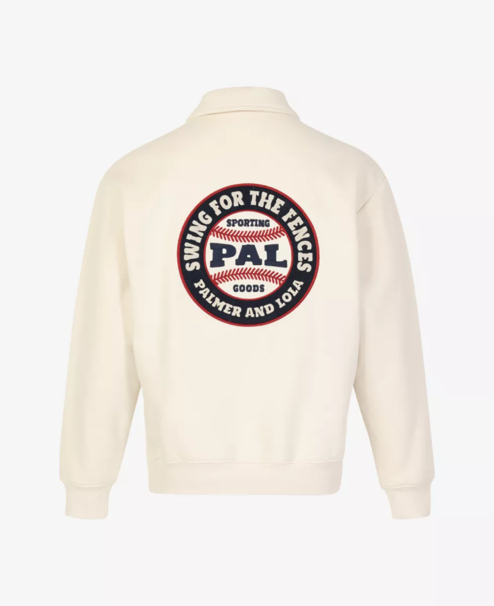 Swing For The Fences halfzip van Pal Sporting Goods in kleur marshmallow. Deze trui heeft een oversized pasvorm en een opdruk op het voor- en achterpand.