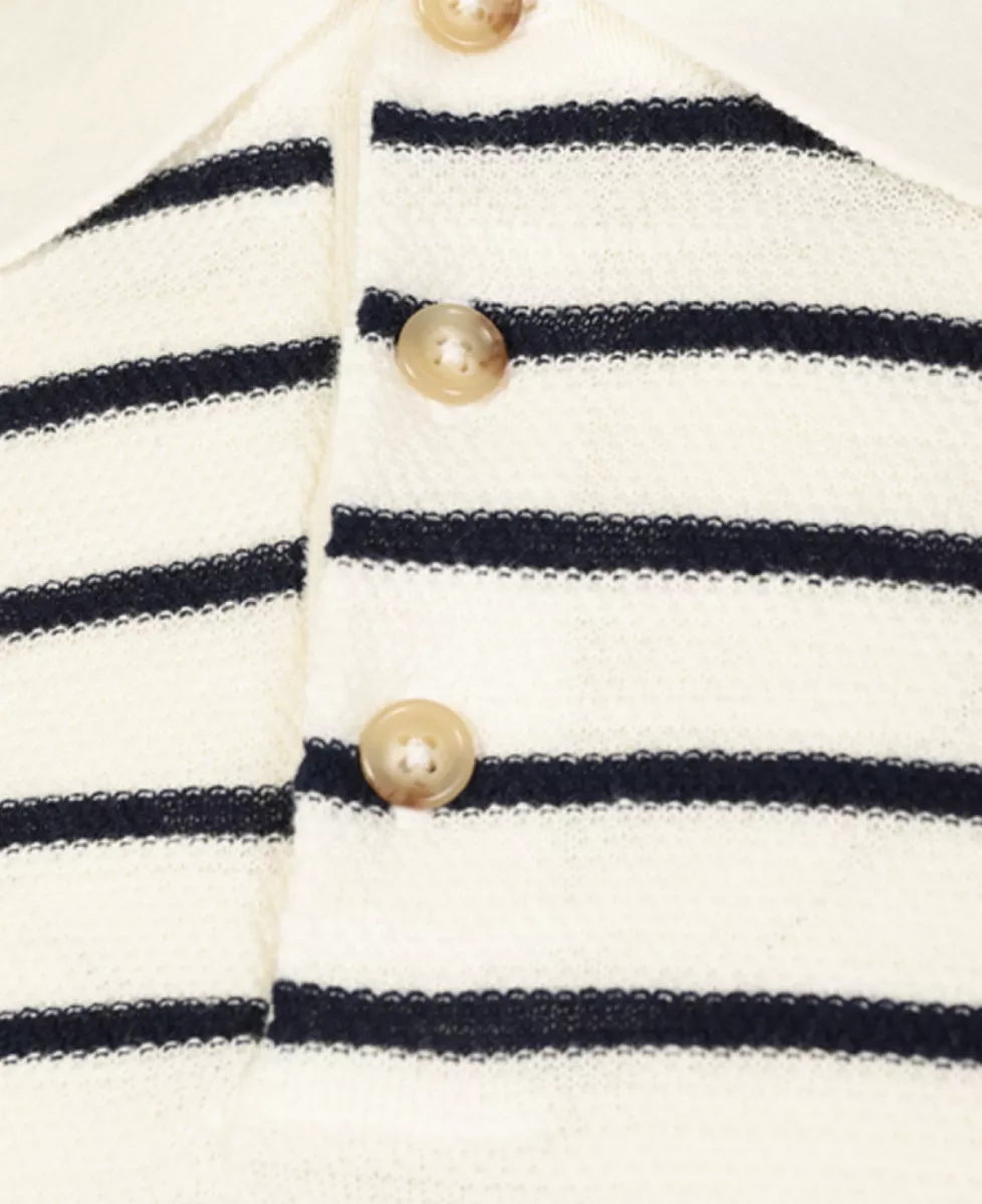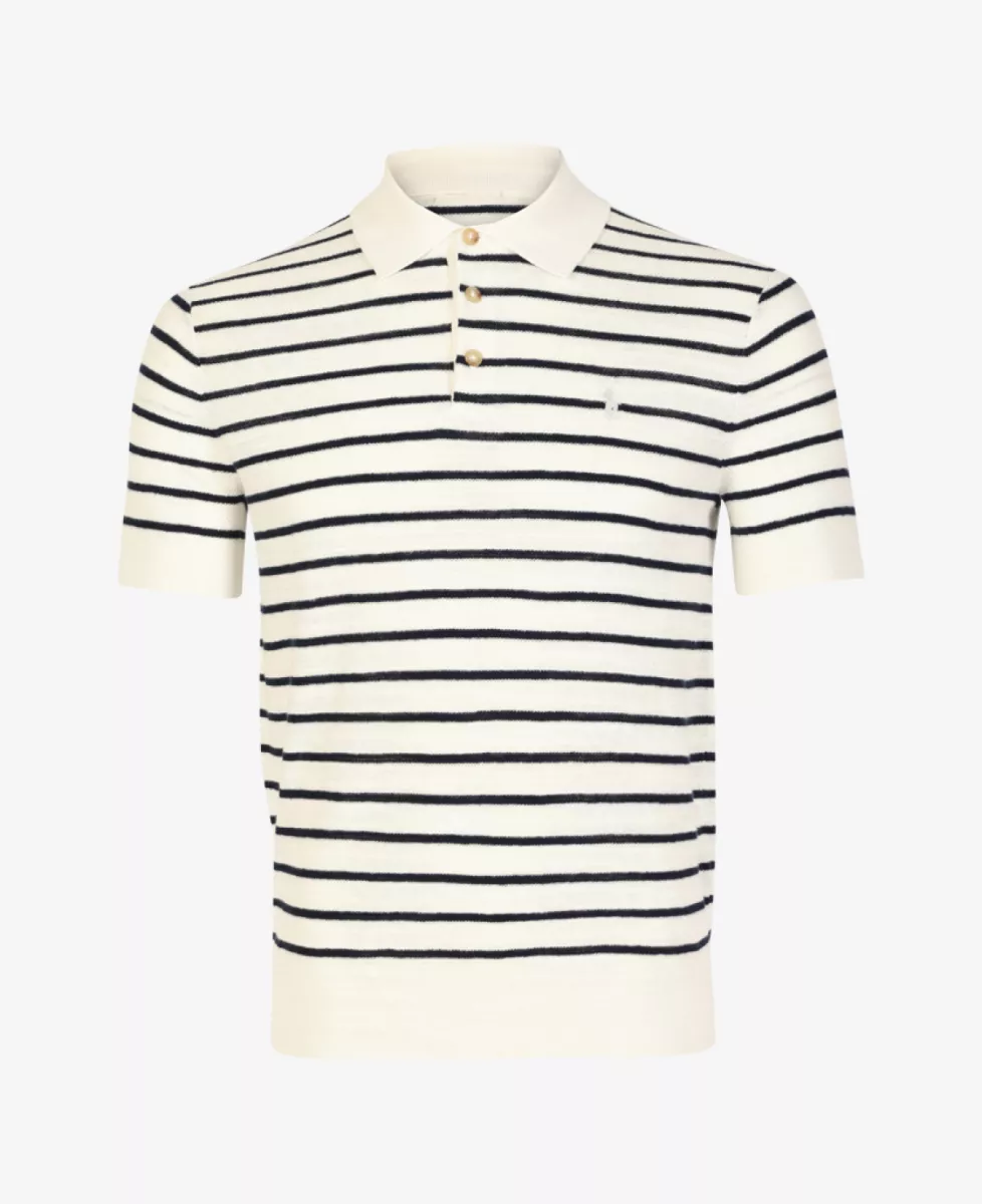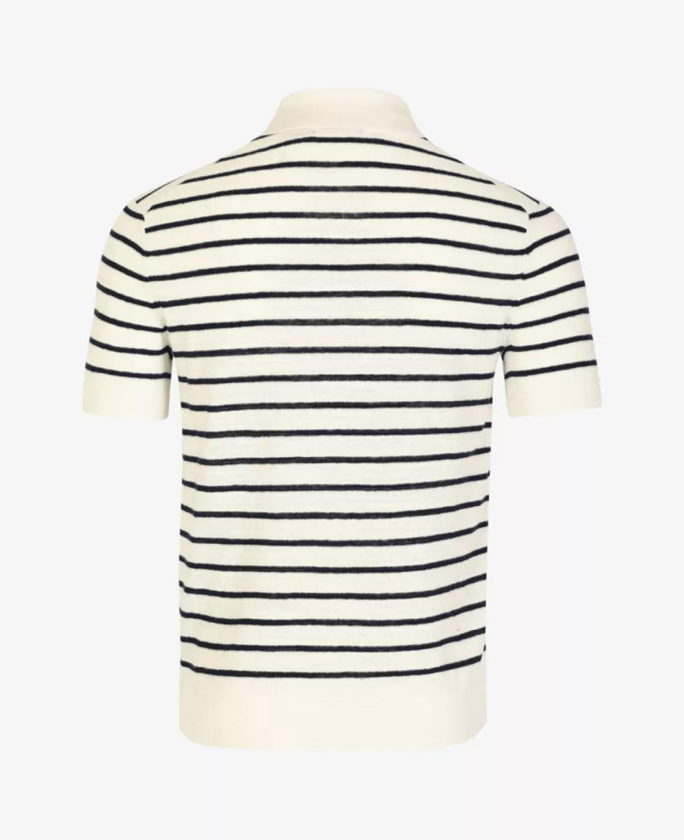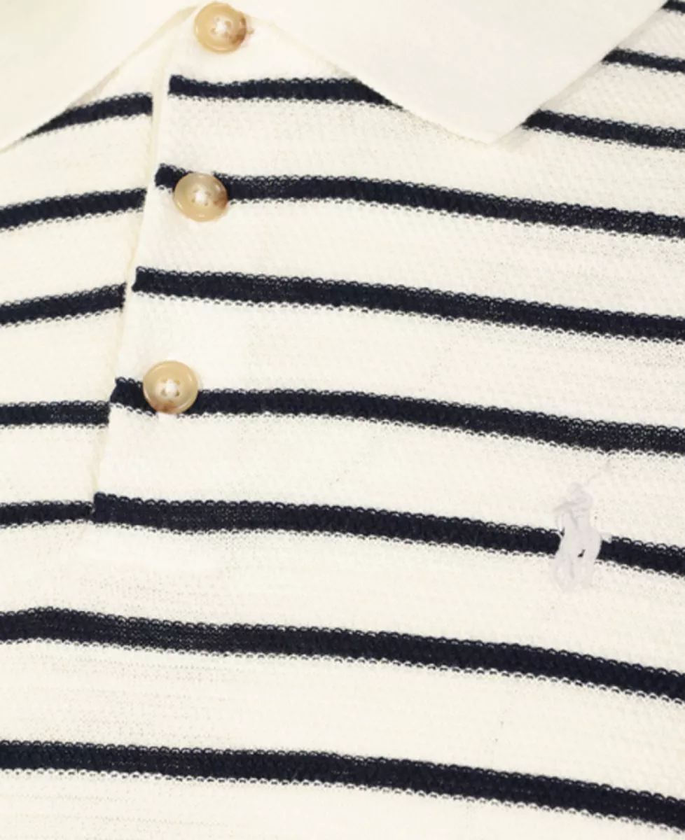 Gebreide polo van Ralph Lauren in wit/navy met een horizontaal streeppatroon. Deze polo is gemaakt van katoen en linnen en heeft het klassieke logo op de borst geborduurd.
