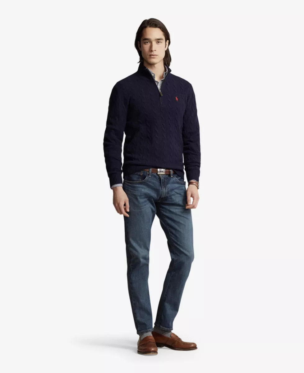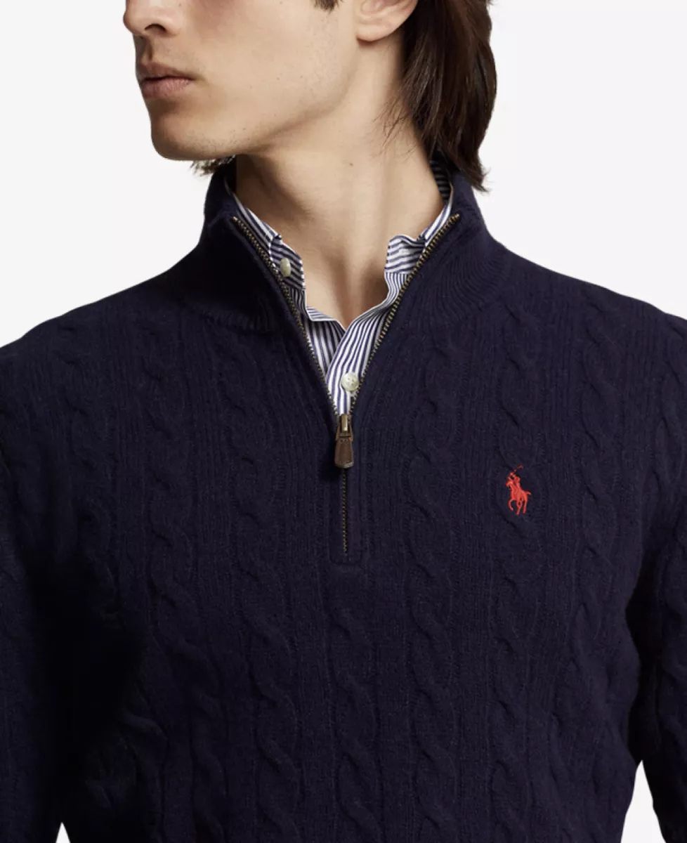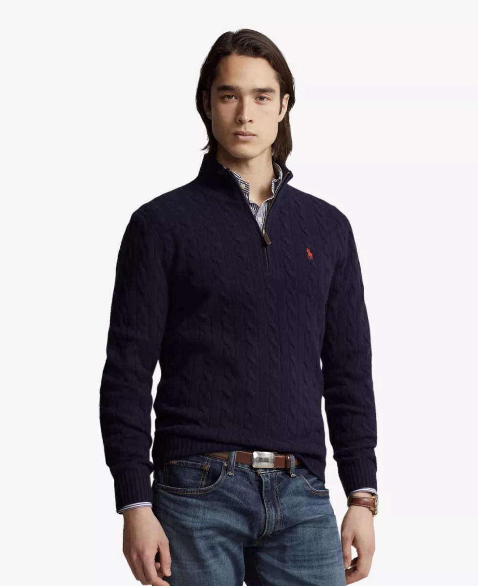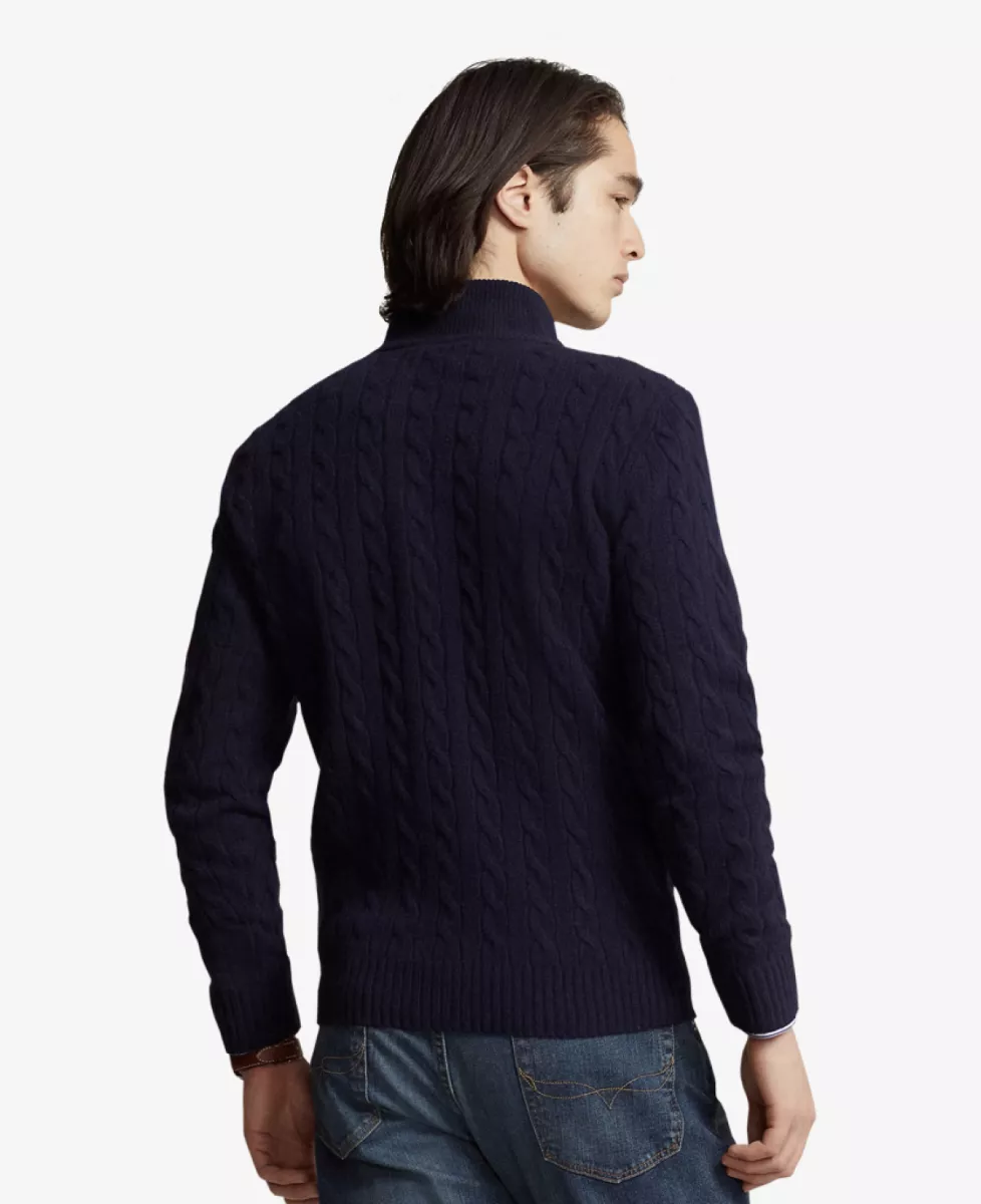 Deze trui van Ralph Lauren met kwartrits is gemaakt van een verfijnde mix van Italiaanse wol en kasjmier en uitgevoerd in het iconische kabelbreisel van Ralph Lauren. Voorzien van een ribgebreide col, suède ritstrekker, lange mouwen met geribde boorden en een ribgebreide zoom. Het geborduurde ponylogo op de borst maakt het geheel compleet. Regular fit voor een klassieke, maar moderne uitstraling.