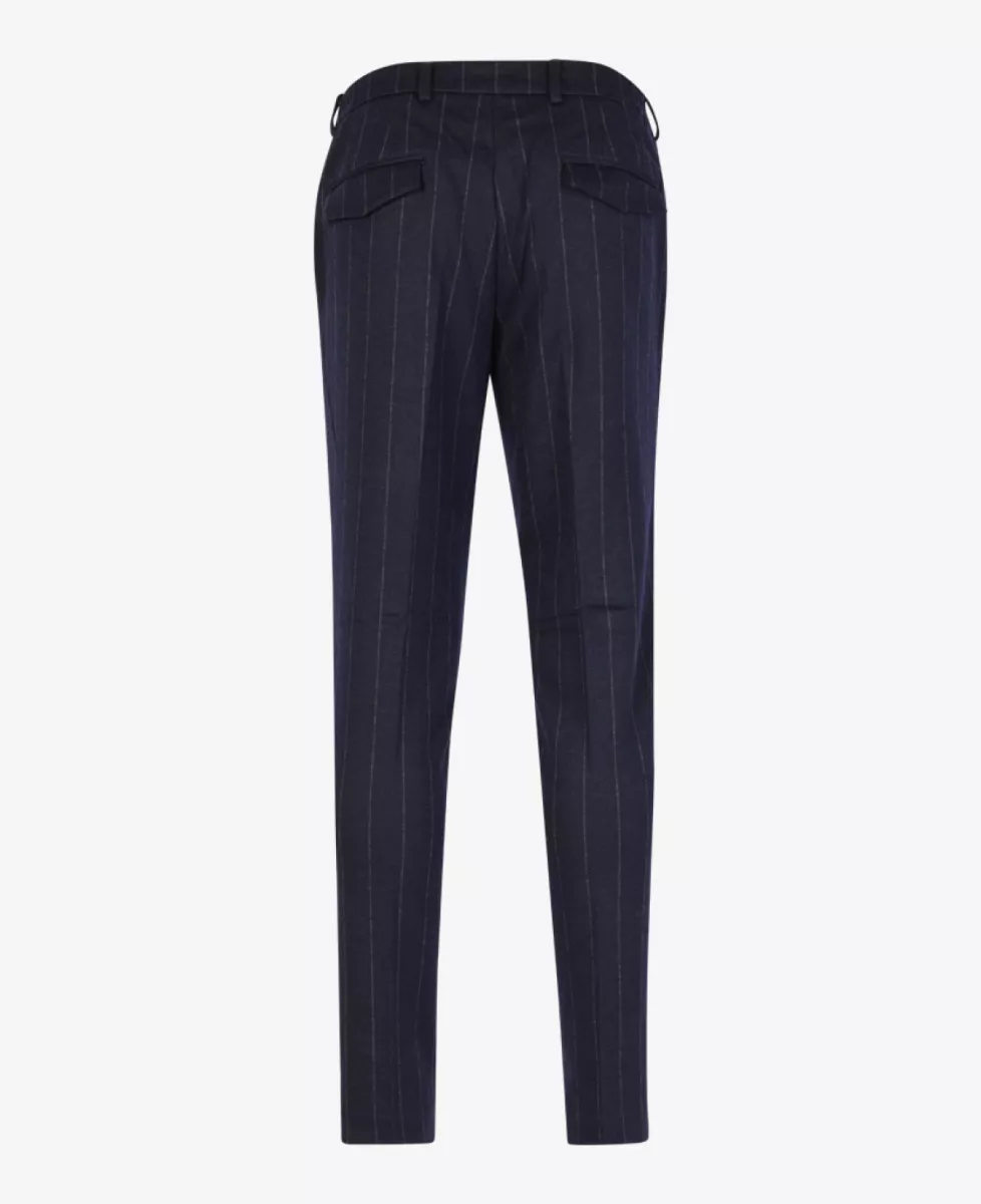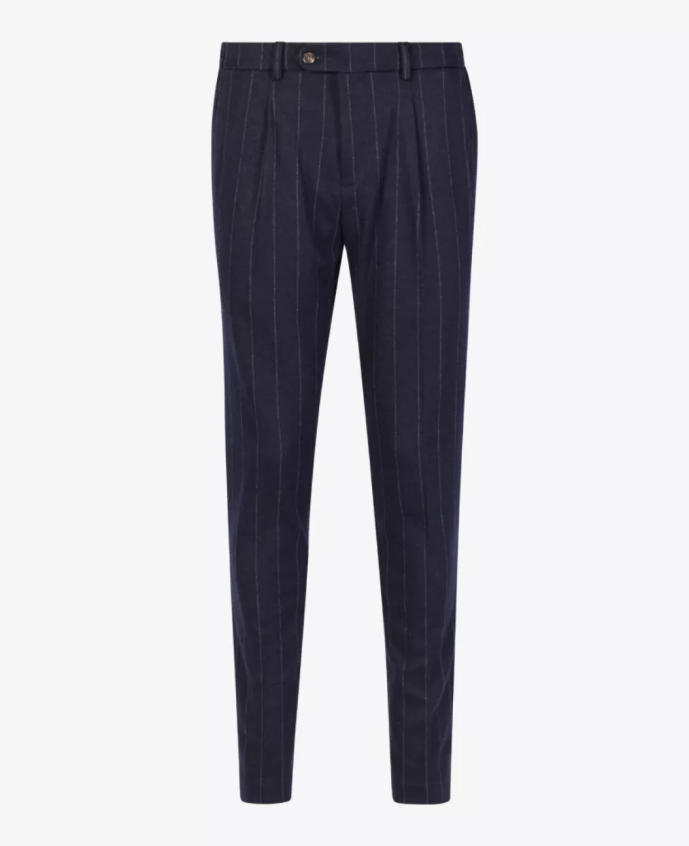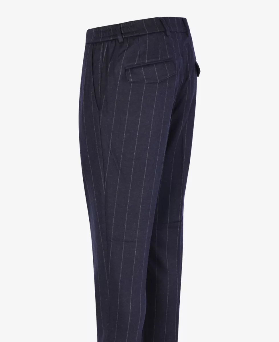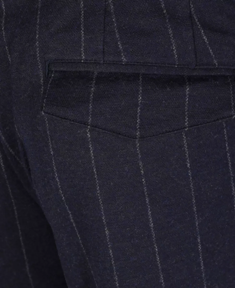 De Seven Dials Murdo 039 pantalon is een elegante slim fit broek met een tijdloos navy krijtstreep patroon dat zowel klassiek als modern oogt. De pantalon is vervaardigd van een hoogwaardige stofmix van polyester, wol en katoen, waardoor hij soepel valt, comfortabel draagt en een luxe uitstraling heeft. Voorzien van een subtiele bandplooi, straalt de Murdo 039 zowel verfijning als veelzijdigheid uit, waardoor hij ideaal is voor zowel formele als smart-casual combinaties.