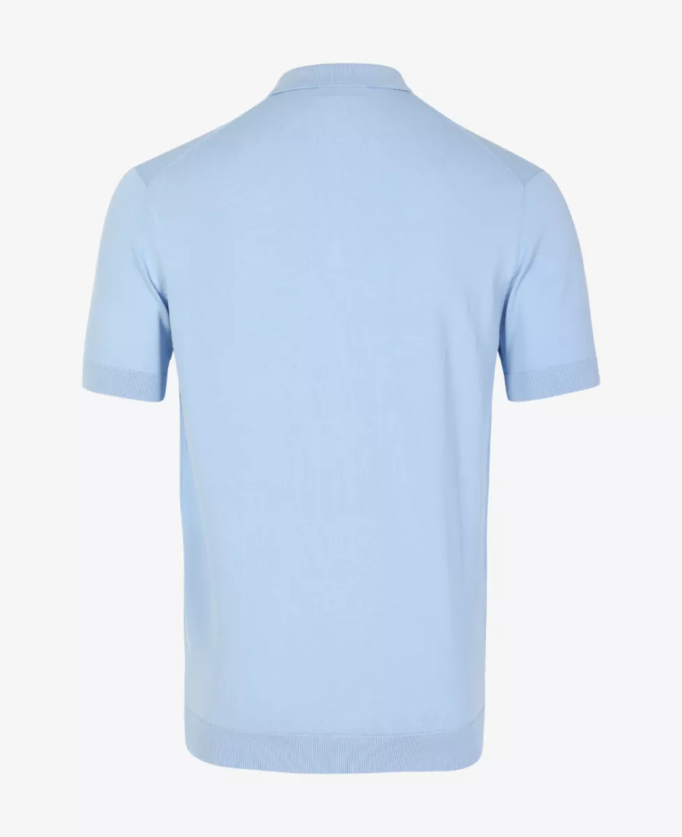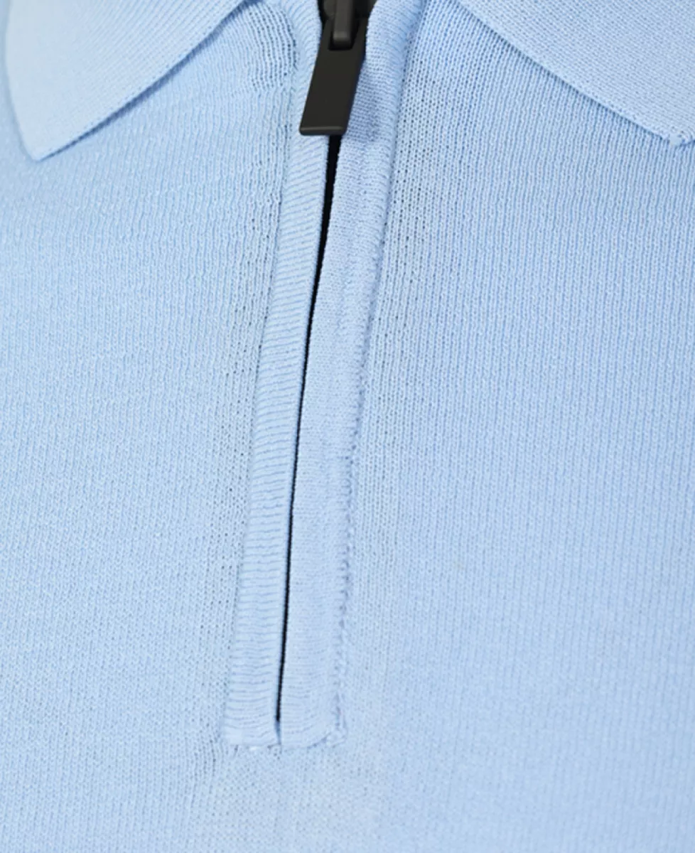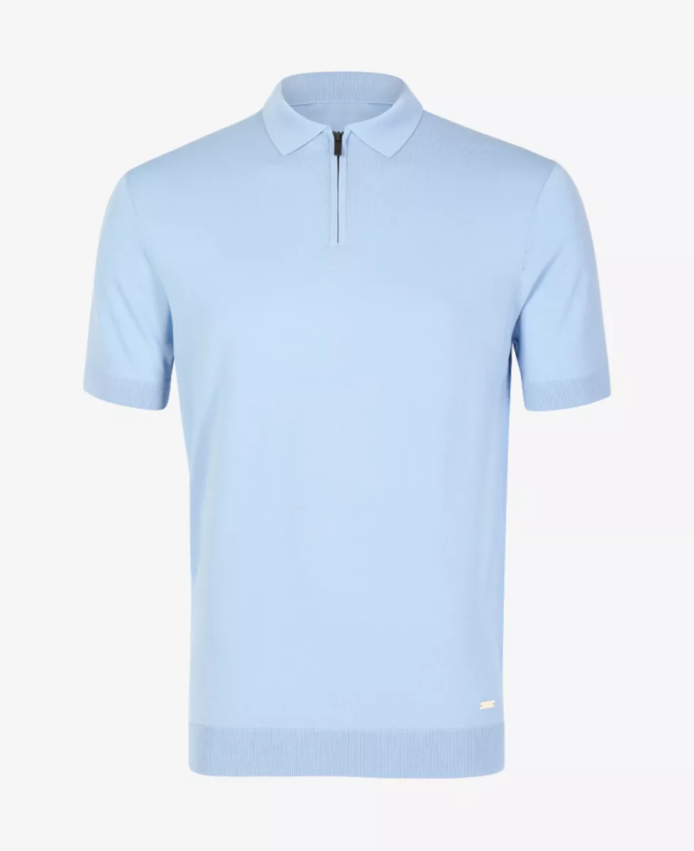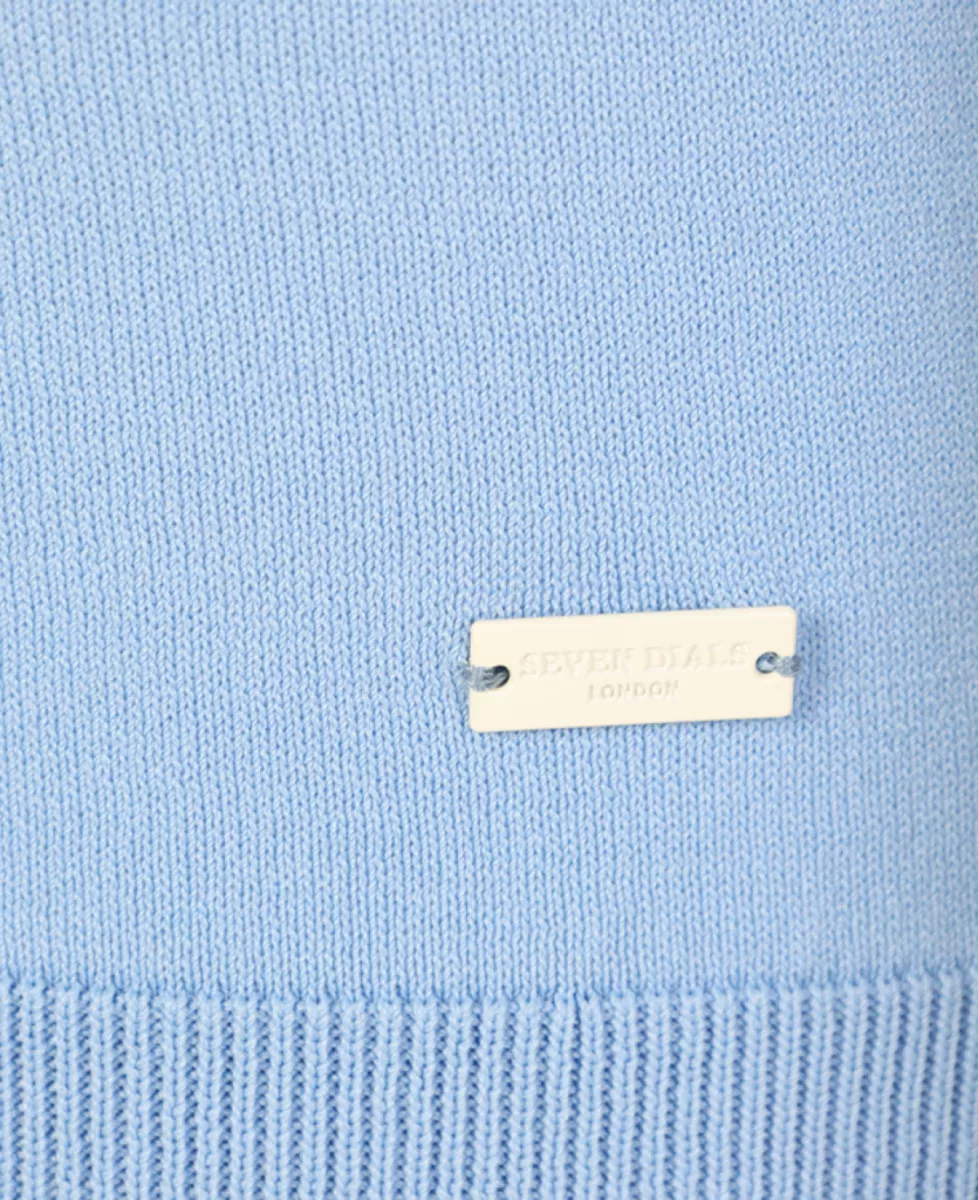 Een lichtgewicht gebreide polo van Seven Dials London, gemaakt van een viscose‑nylonmix. De polo heeft een kraag met ritssluiting. Het materiaal voelt soepel aan.