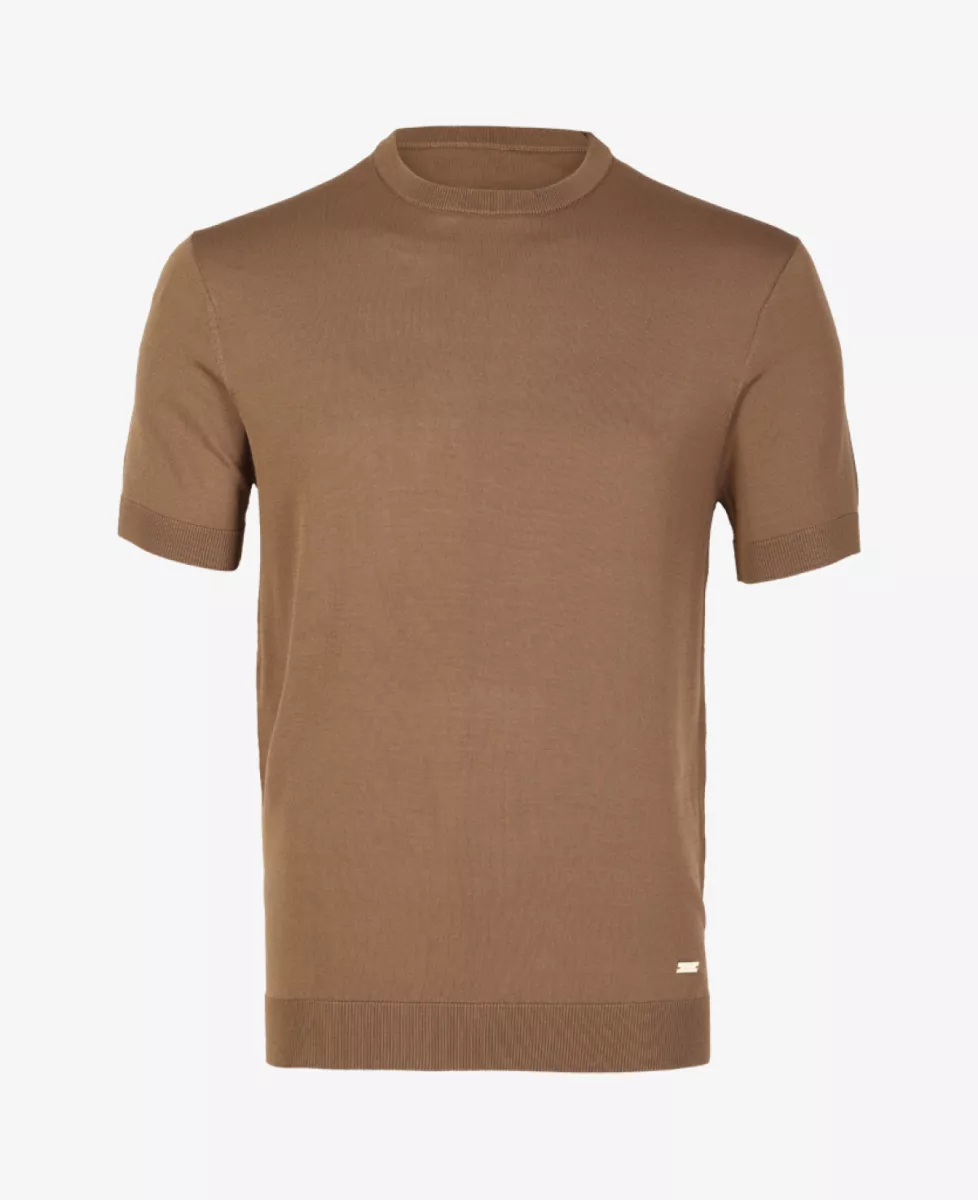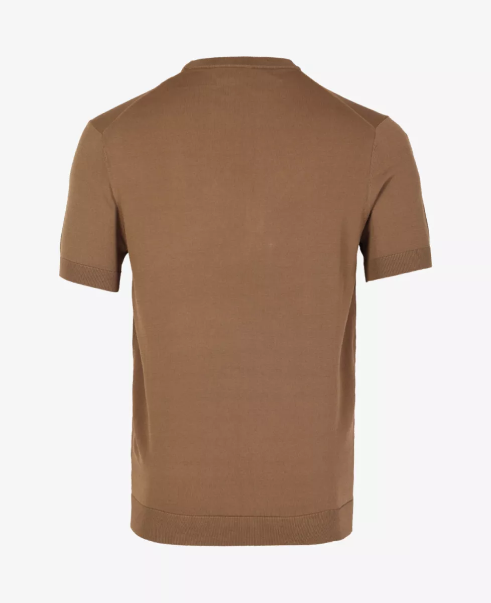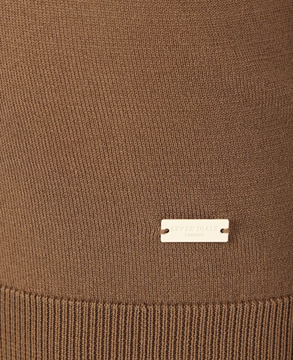Een lichtgewicht gebreide polo van Seven Dials London, gemaakt van een viscose‑nylonmix. De polo heeft een ronde hals en het materiaal voelt soepel aan.
