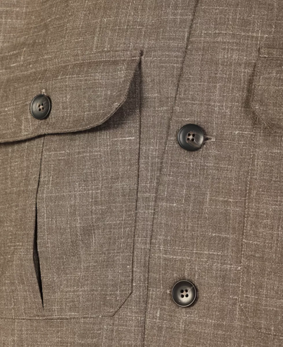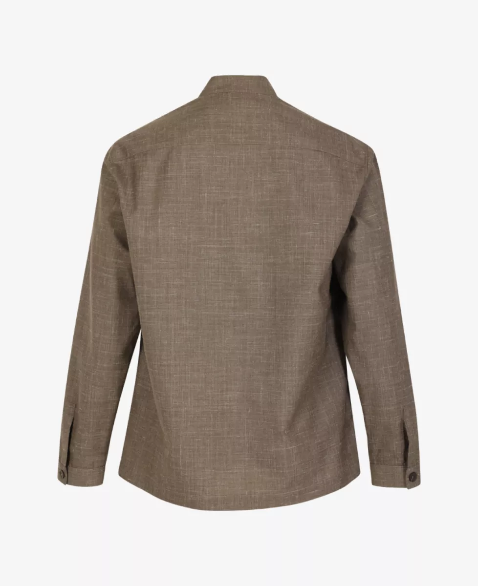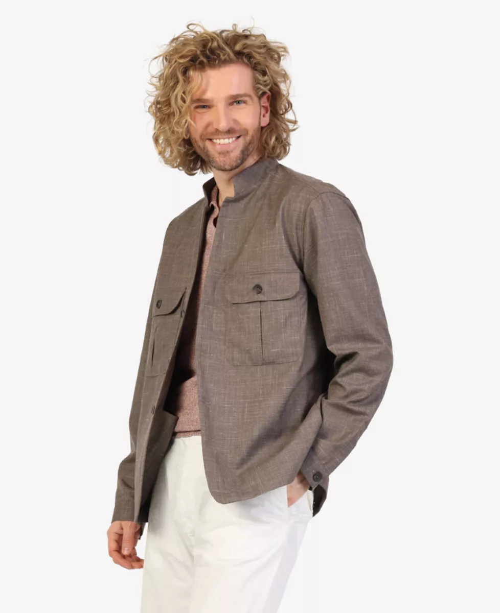 Overshirt van Xacus in gemêleerd taupe, met opstaande kraag, borst- en steekzakken en knoopsluiting. Dankzij de mix van scheerwol, zijde en linnen is dit overshirt een elegante toevoeging aan de lente- en zomergarderobe.