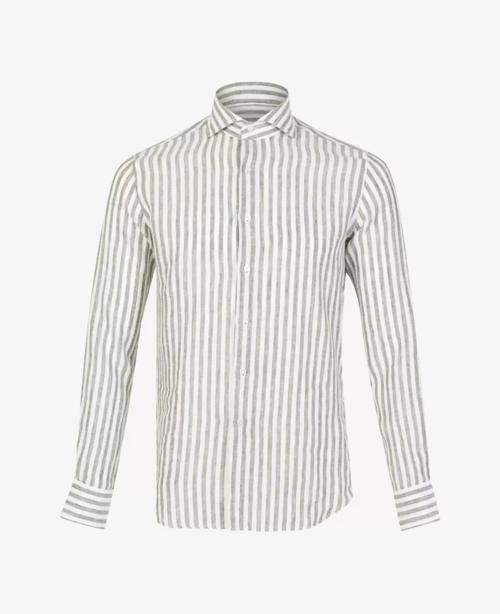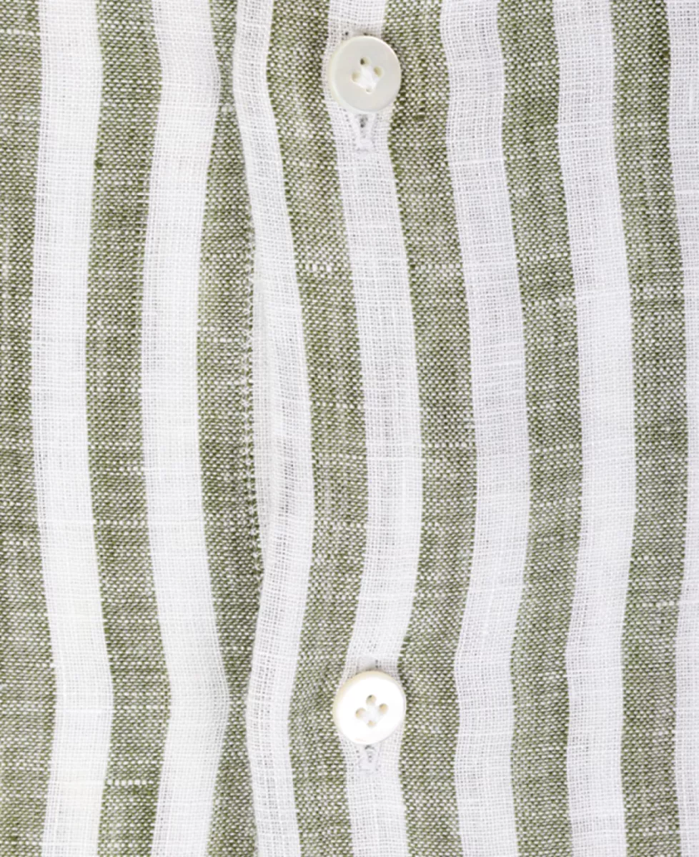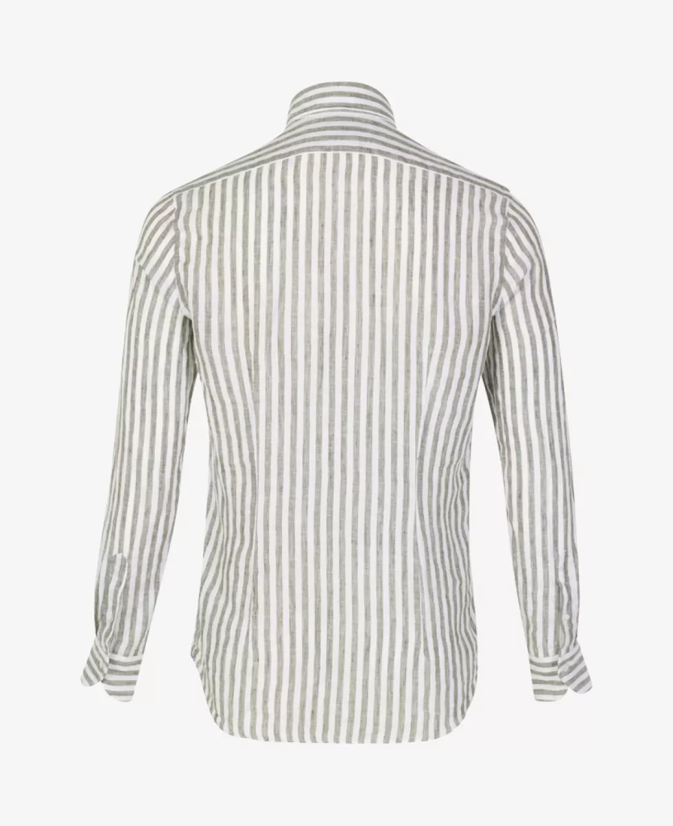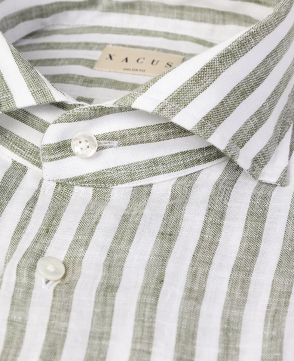 ‘Washed shirt’ van Xacus; een linnen overhemd in een wit/groen streeppatroon, gemaakt van 100% hoogwaardig linnen.